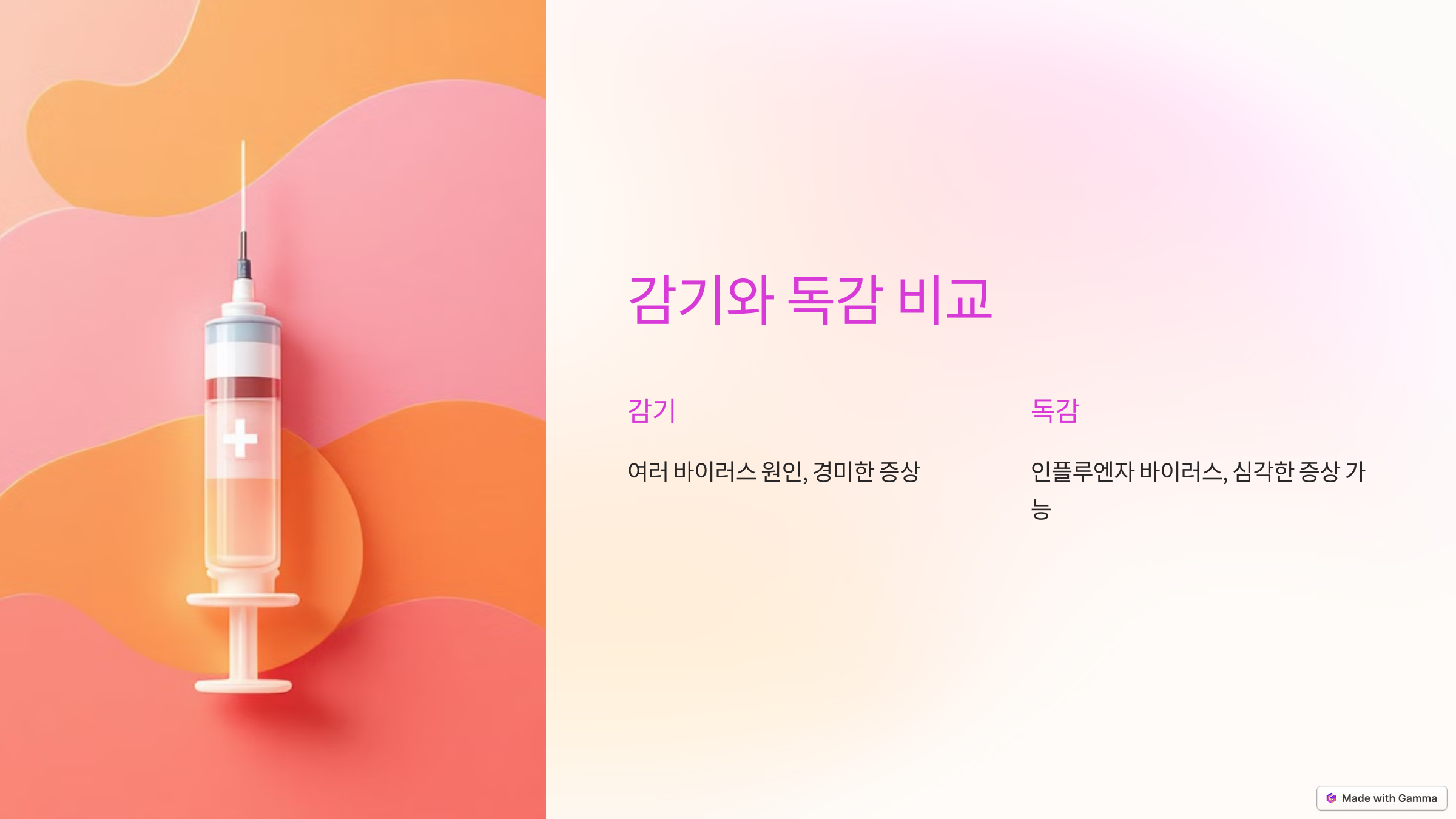 • 독감은 인플루엔자 바이러스(A, B형)에 의해 발생하며, 전염성이 강하고 중증으로 진행될 가능성이 높습니다.