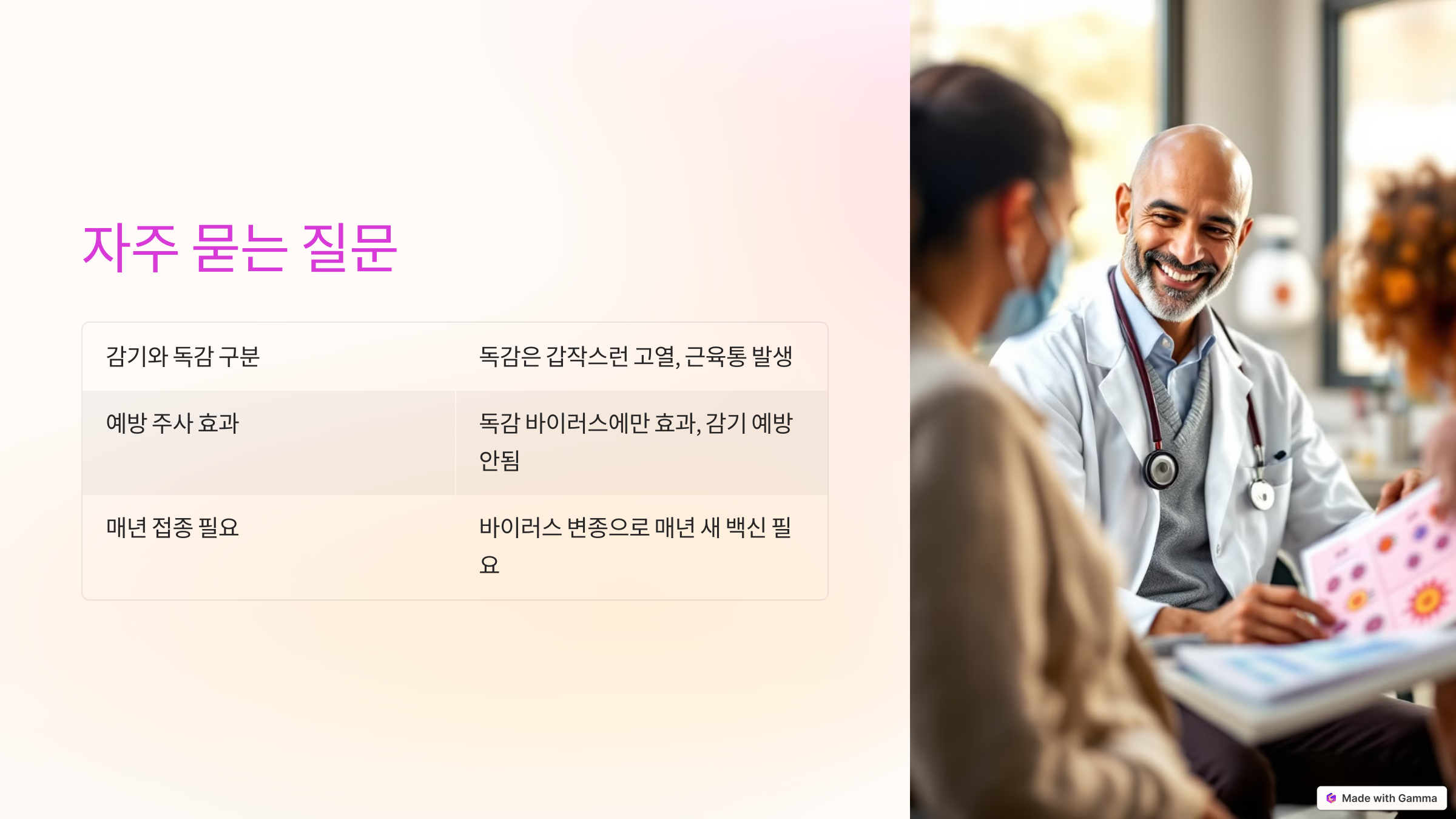 • 반면 독감은 감기보다 전염성이 높고, 어린이나 노약자, 만성질환자에게는 심각한 합병증을 유발할 위험이 있어 매년 백신 접종이 권장됩니다.