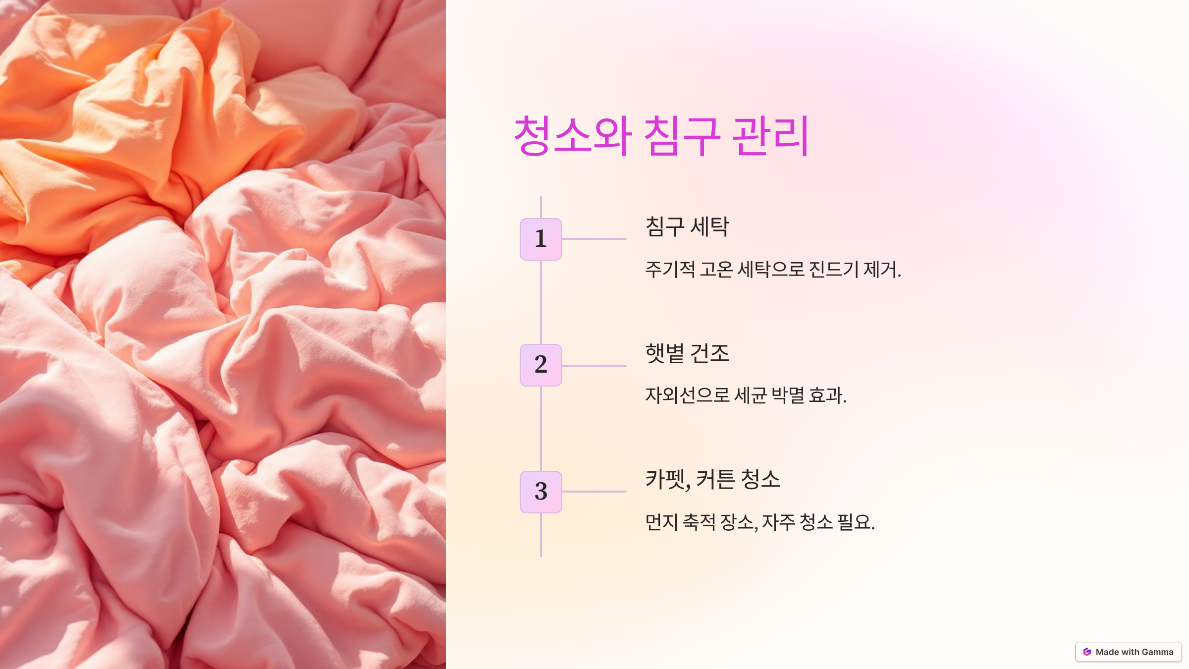 - 침구 관리: 베개와 이불 등은 진드기와 먼지가 쉽게 쌓이기 때문에, 주기적으로 고온에서 세탁하고 햇볕에 말려야 합니다.