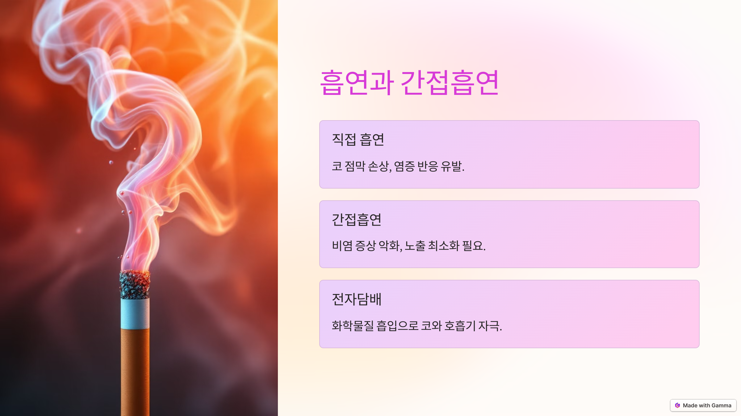 - 전자담배: 전자담배 또한 증기를 통해 다양한 화학 물질을 흡입하게 되어, 코와 호흡기에 자극을 줄 수 있습니다.