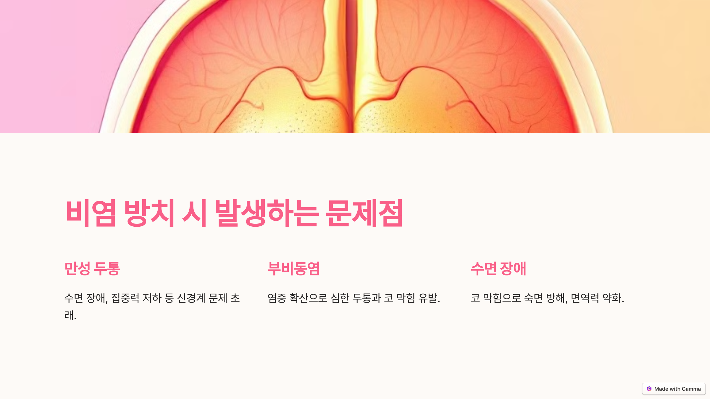 비염을 방치하면 부비동염, 만성 두통, 수면 장애, 호흡기 질환 등으로 발전할 수 있습니다. 증상이 심해지기 전에 조기 치료가 필요합니다.
