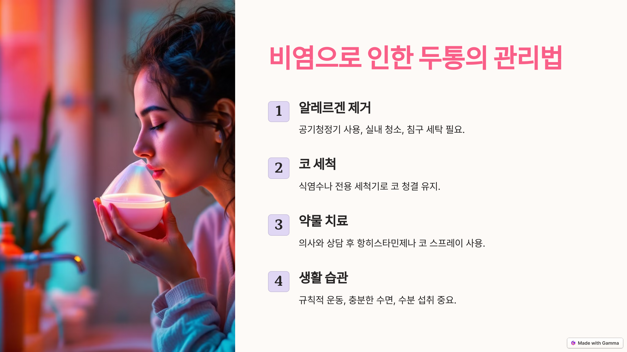 비염으로 인한 두통을 줄이기 위해 주기적인 코 세척이 도움이 됩니다. 식염수나 전용 코 세척기로 코를 깨끗하게 유지하면 염증 완화에 도움이 됩니다. 또한, 적절한 실내 습도를 유지하여 비강이 건조해지지 않도록 관리하는 것이 좋습니다.