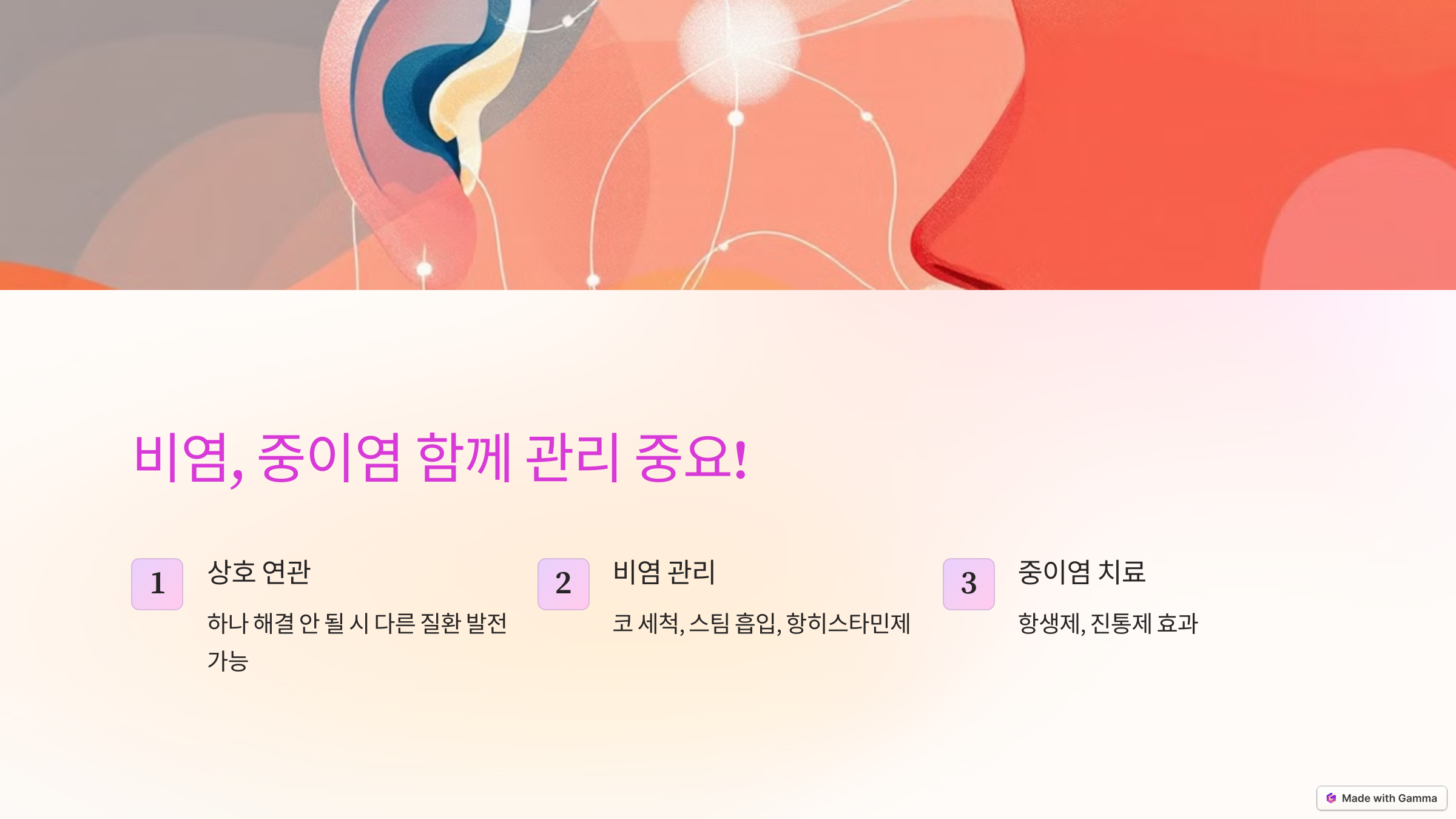비염과 중이염은 상호 연관된 질환으로, 하나의 문제를 해결하지 않으면 다른 질환으로 발전할 수 있습니다. 따라서 비염을 효과적으로 관리함으로써 중이염을 예방할 수 있으며, 중이염 치료에도 좋은 영향을 미칠 수 있습니다. 🤗 비염 관리에는 코 세척, 스팀 흡입, 항히스타민제 사용 등이 있으며, 중이염 치료에는 항생제와 진통제 사용이 효과적입니다. 또한 생활습관 개선과 유스타키오관의 기능을 유지하는 것이 중요합니다.