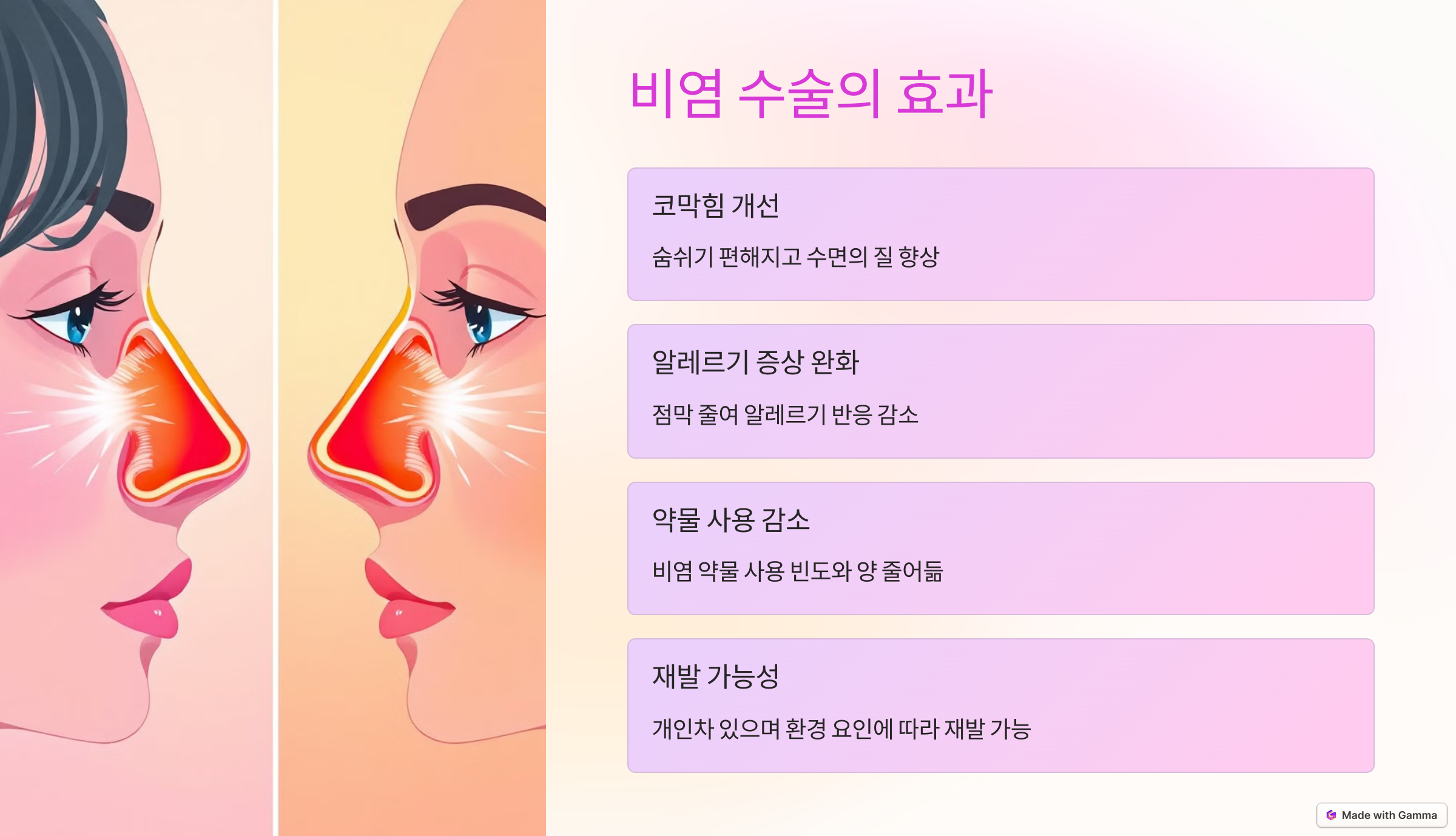 비염 수술은 단순 약물치료로 해결되지 않는 만성적인 문제를 개선하는 데 효과적입니다. 수술 후 주요 효과는 다음과 같습니다: