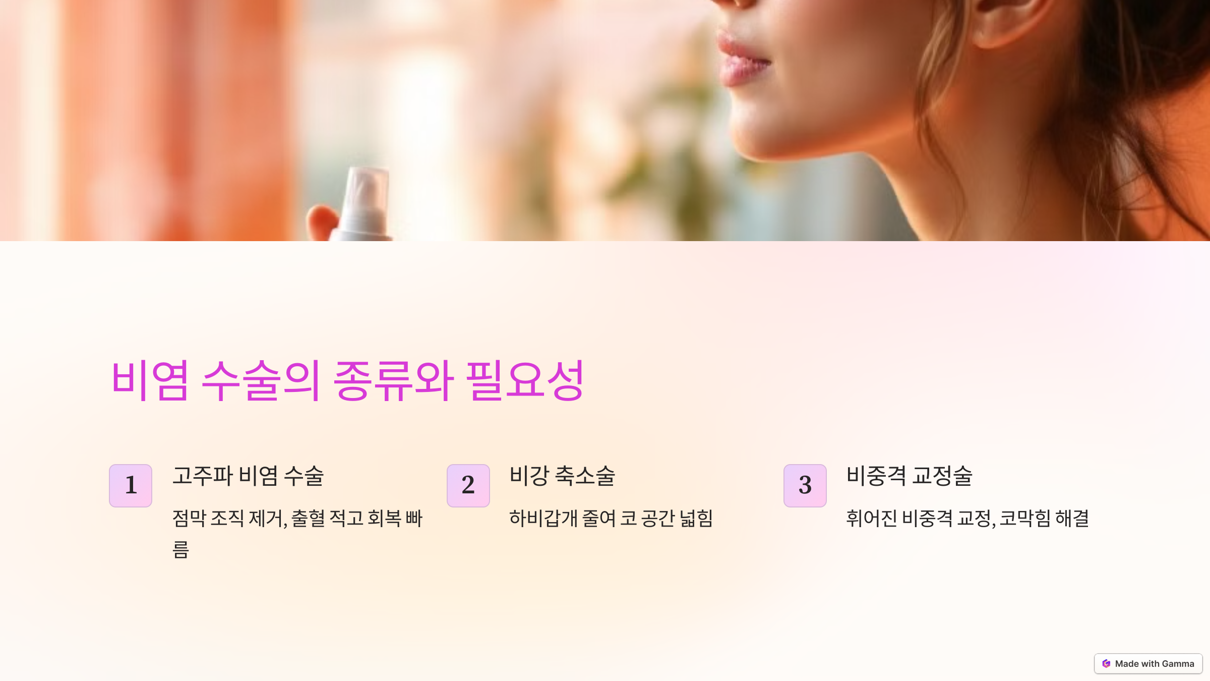 비염 수술은 증상이 매우 심하거나 다른 치료법이 효과가 없는 경우에만 필요할 수 있습니다. 경미한 비염의 경우 수술보다 약물 치료와 생활 관리가 우선됩니다.