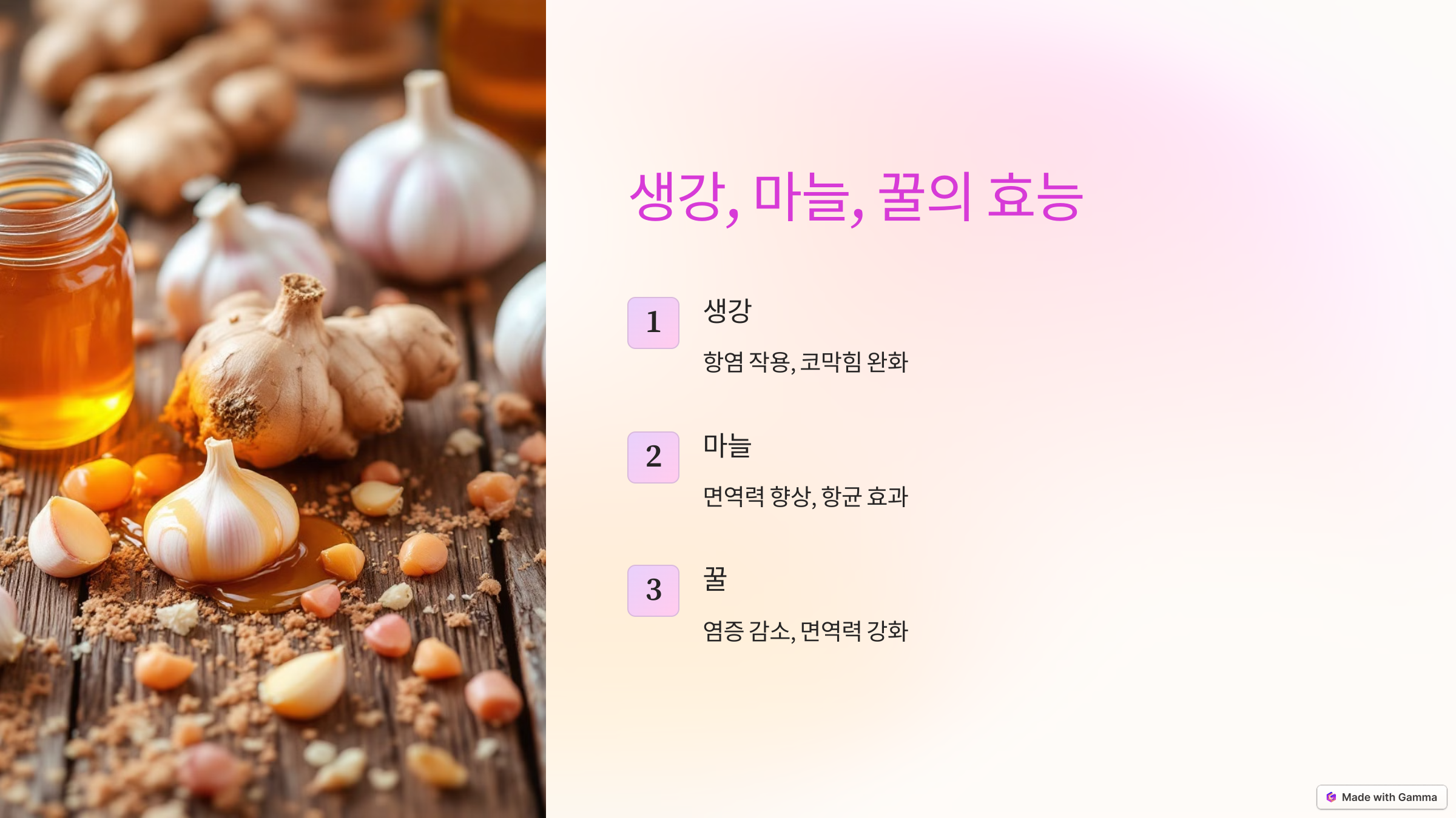 생강은 강력한 항염 작용을 가지고 있어 비염 증상을 완화하는 데 도움이 됩니다. 생강에 포함된 진저롤 성분은 염증을 억제하고, 비강을 열어 코막힘을 완화해 줍니다. 또한, 생강차는 체내 순환을 촉진하여 코막힘을 줄여줍니다.