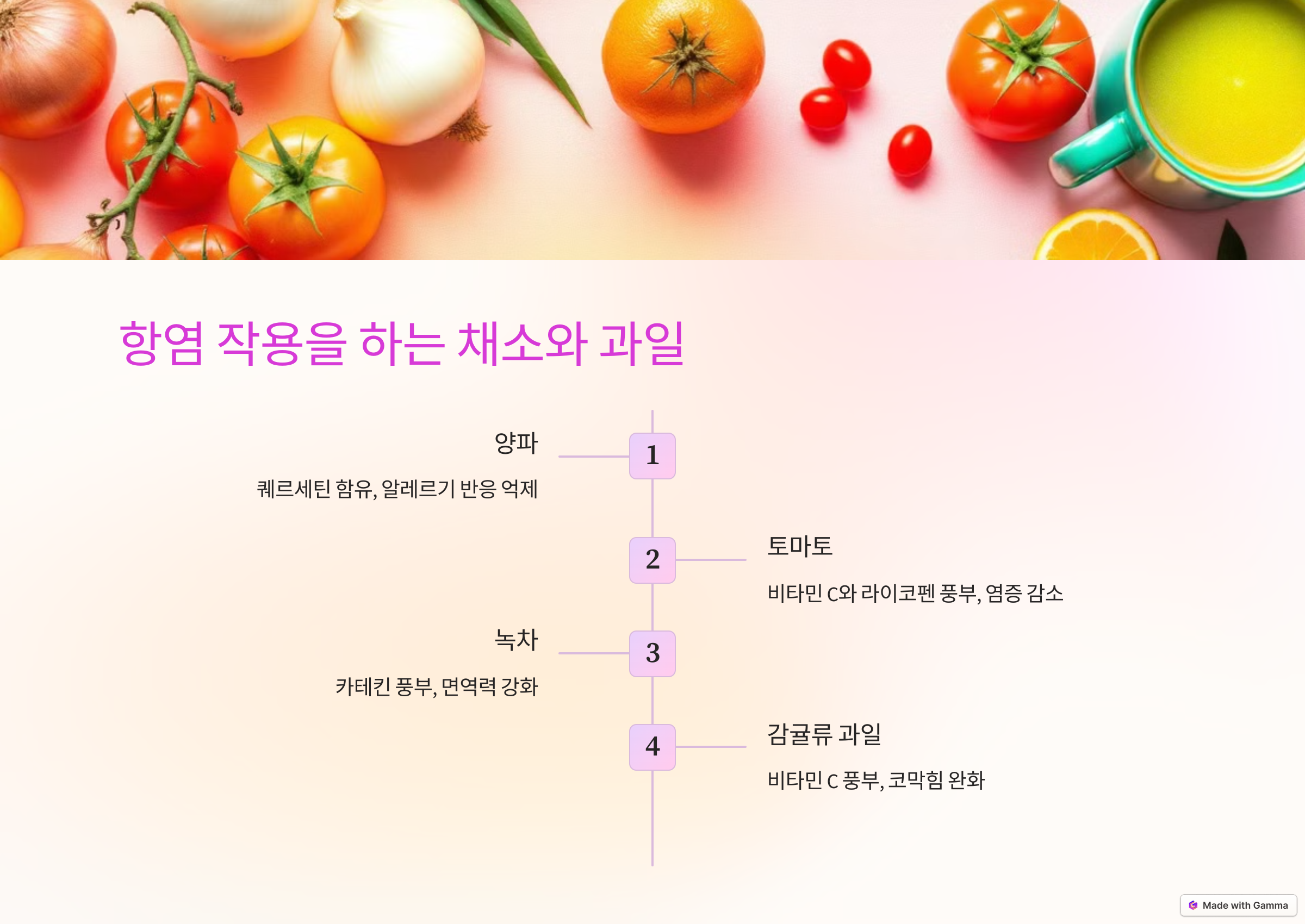 비염 증상을 완화하기 위해서 면역력을 높이고 염증을 줄여주는 음식 섭취에 신경 써 보세요. 생강, 마늘, 꿀, 오메가-3가 풍부한 생선, 시금치, 브로콜리 등의 건강한 식품을 꾸준히 섭취하면 비염 증상을 효과적으로 관리할 수 있습니다. 일상에서 이 음식들을 활용하여 비염을 완화하고, 건강한 삶을 유지해 보세요! 😊