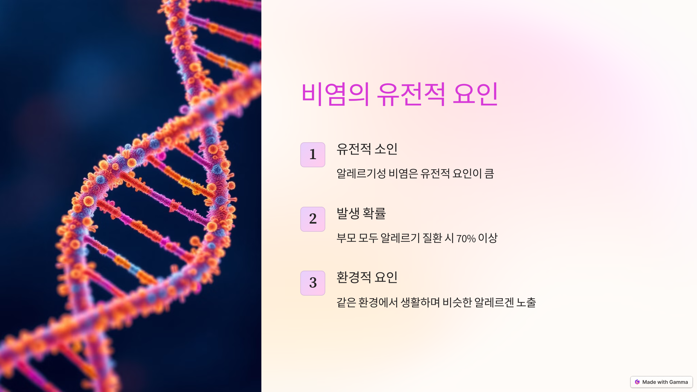 이는 특정 유전자가 알레르기에 대한 민감성을 유발할 가능성이 높기 때문입니다. 다만, 어떤 유전자가 알레르기 비염을 유발하는지에 대한 연구는 계속 진행 중이며, 명확하게 밝혀지지는 않았습니다.
