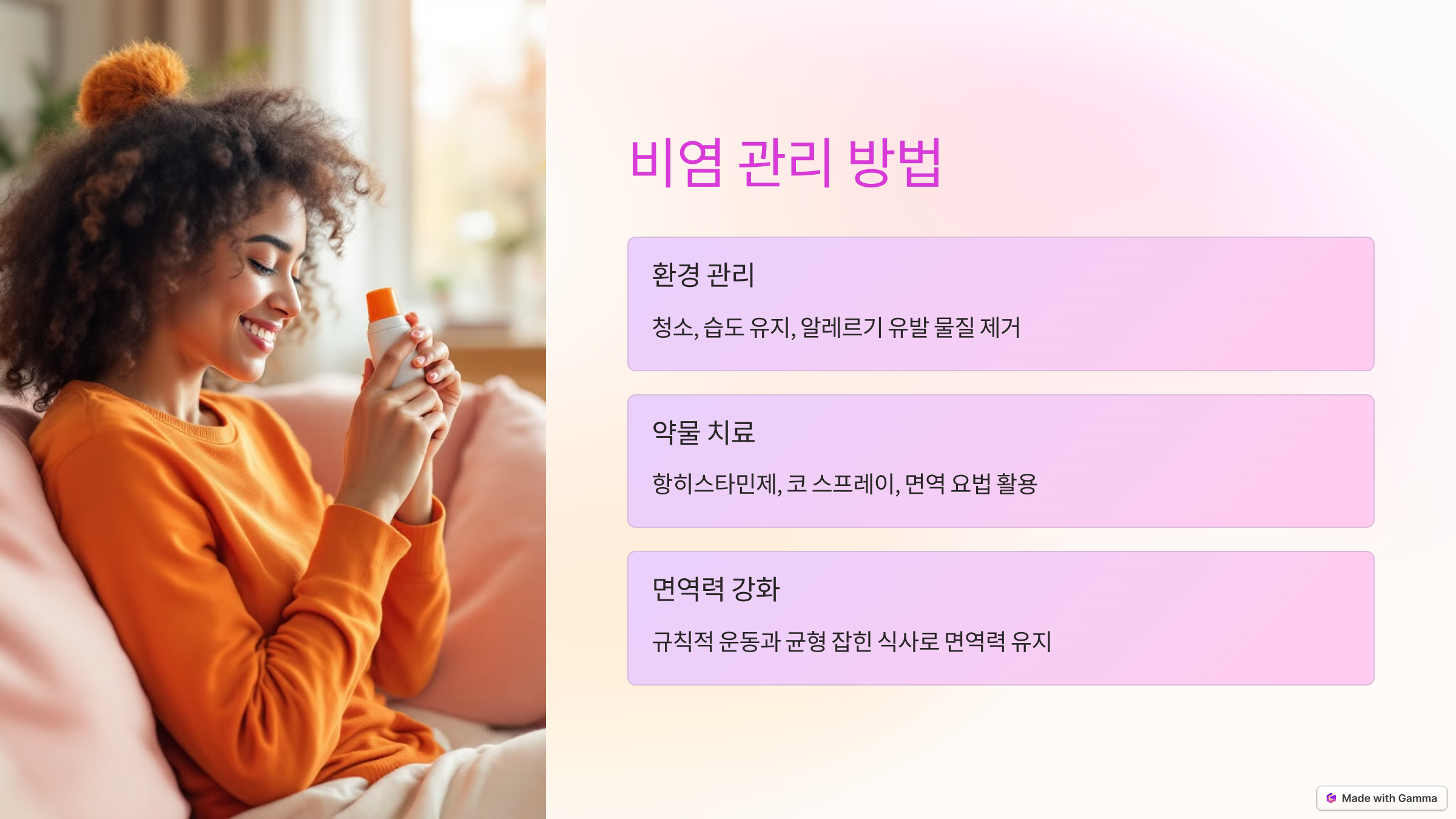 • 항히스타민제나 코 스프레이는 비염 증상을 완화하는 데 효과적입니다.