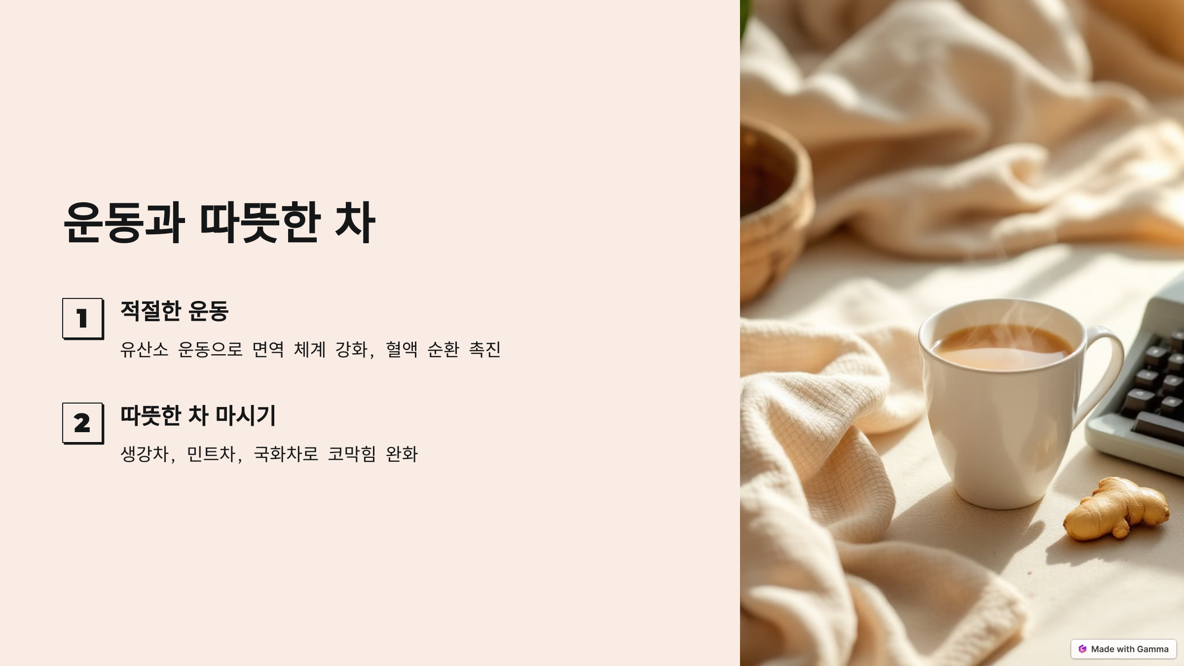 생강차, 민트차, 국화차 등은 코막힘을 줄이고 몸을 따뜻하게 해 비염 증상을 완화시켜 줍니다. 특히 생강은 항염 작용이 있어 염증을 줄이는 데 효과적입니다. 따뜻한 차는 몸을 따뜻하게 해주고, 코 점막을 촉촉하게 유지하는 데 도움을 줍니다.