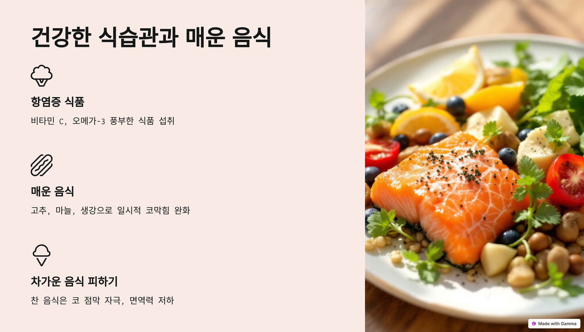 매운 음식은 일시적으로 코막힘을 완화시켜주는 효과가 있지만, 과도하게 섭취할 경우 다른 문제를 일으킬 수 있으니 적당히 섭취하는 것이 좋습니다.