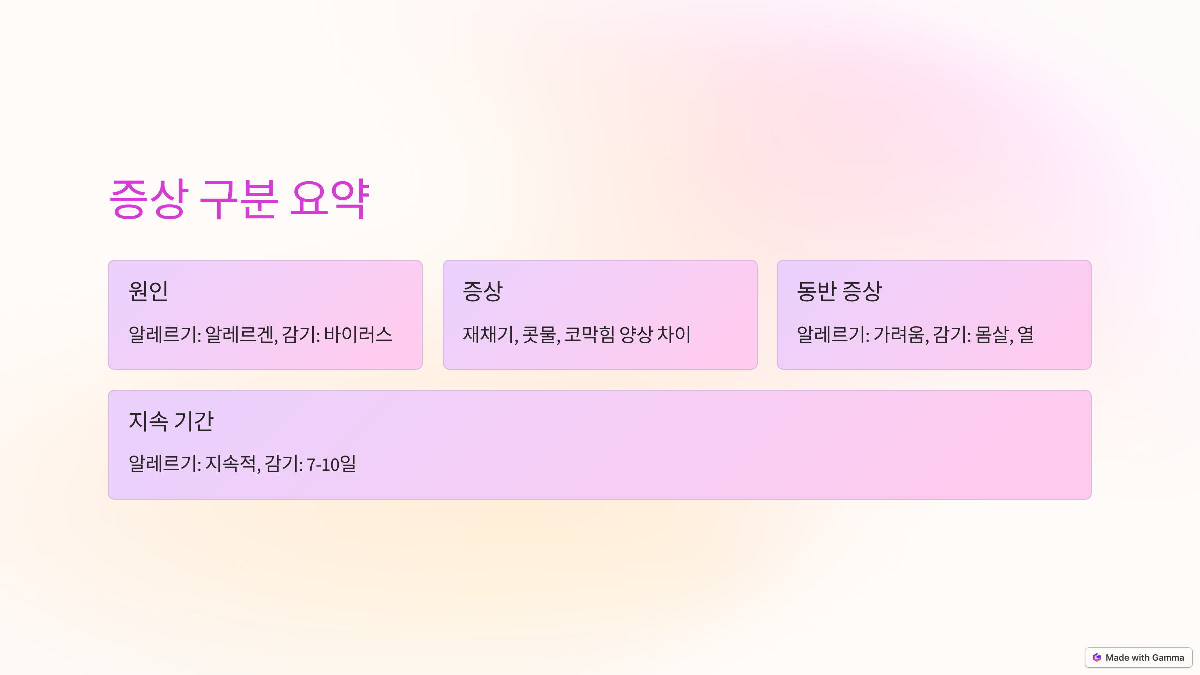 | 원인 | 알레르겐(꽃가루, 먼지, 동물 털) | 바이러스(리노바이러스 등) |