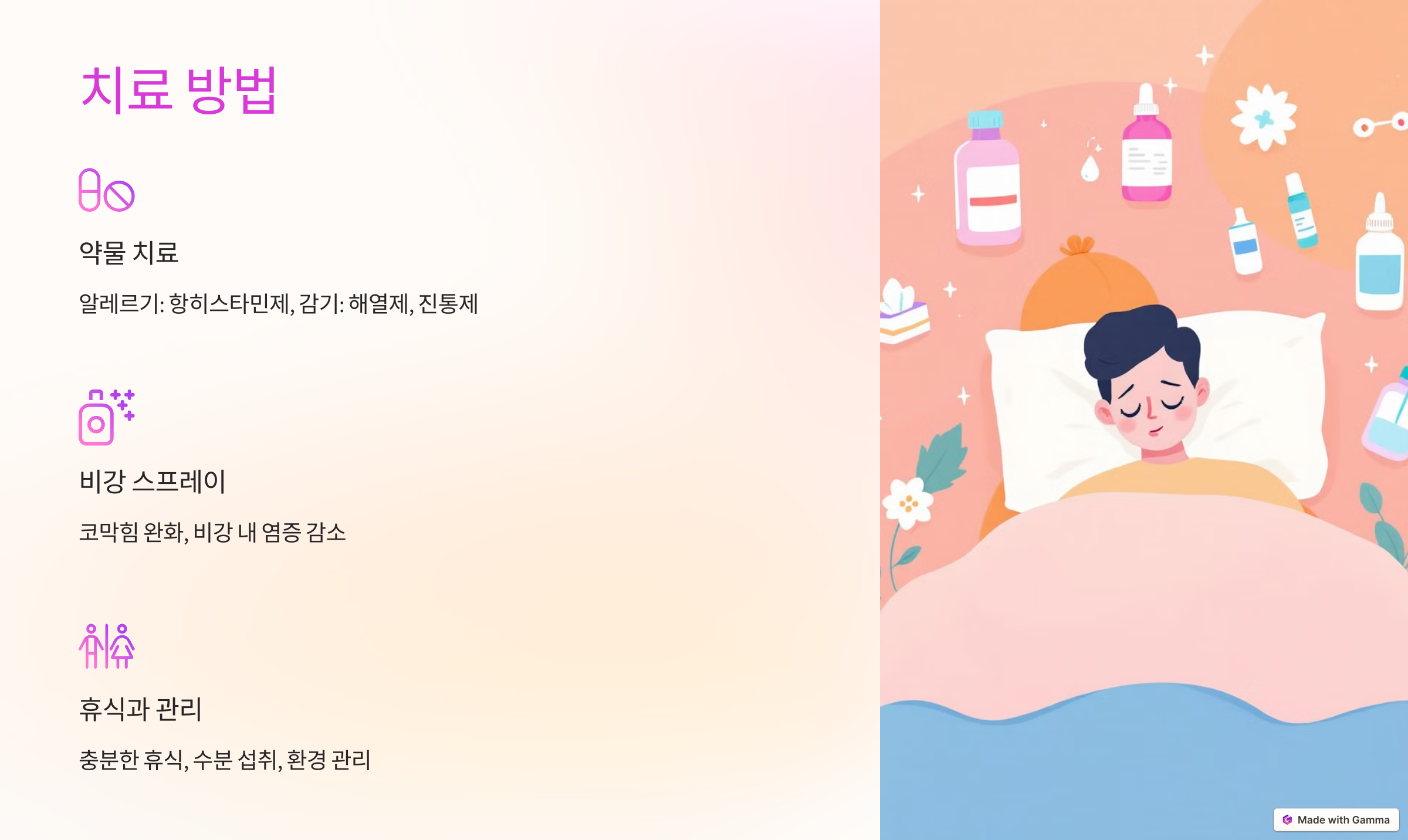 재채기 빈도, 콧물 색상, 코막힘의 양상, 그리고 열과 몸살 여부 등을 통해 두 질환을 구분할 수 있습니다. 증상이 나타났을 때는, 자신의 상태를 잘 관찰하고 적절한 대처법을 선택하여 빠른 회복을 도모하세요! 😊