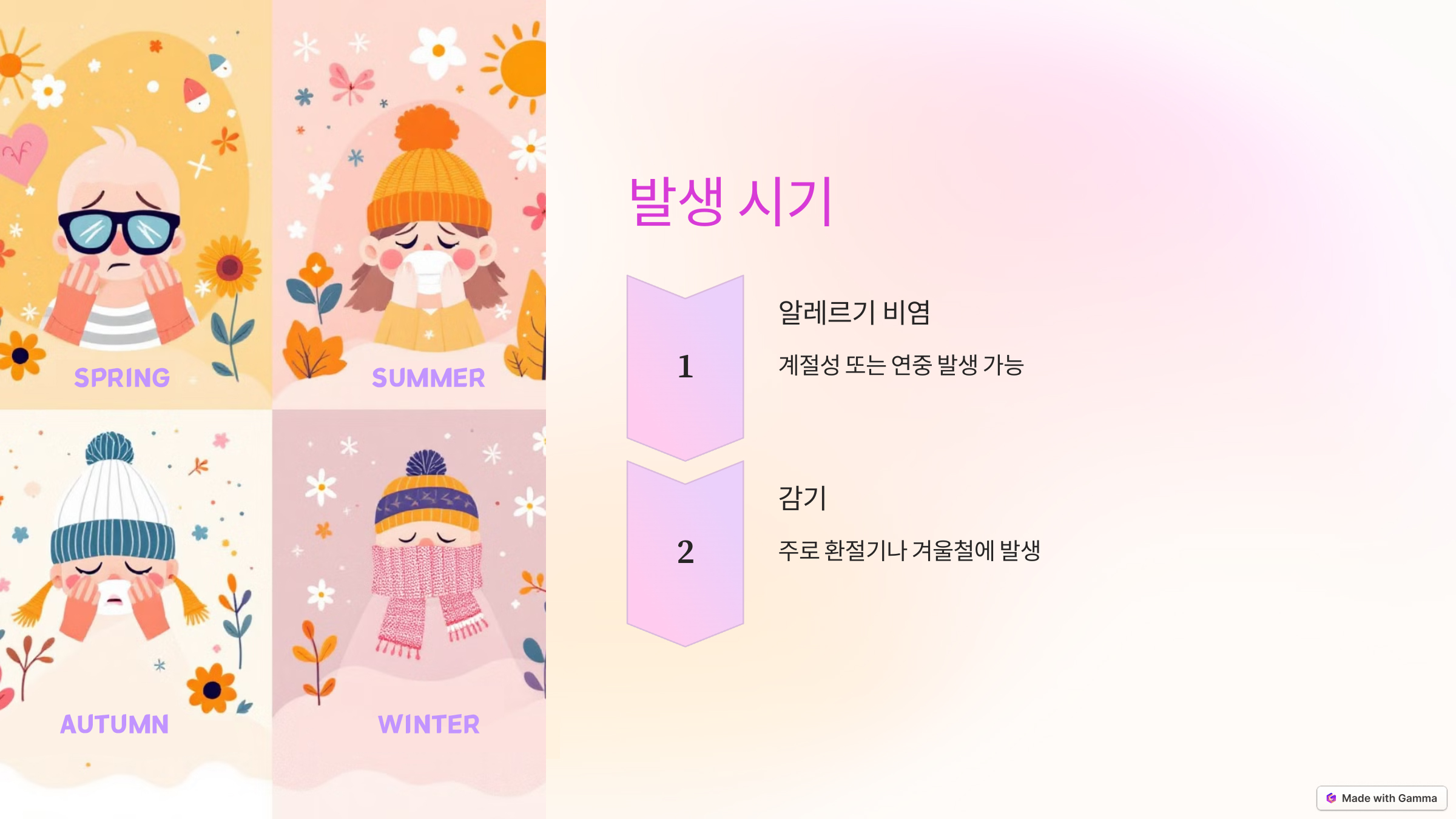 - 특정 계절(봄, 가을)에 더 자주 발생하거나, 집먼지 진드기 같은 물질에 지속적으로 노출되면 증상이 상시 발생할 수 있습니다.