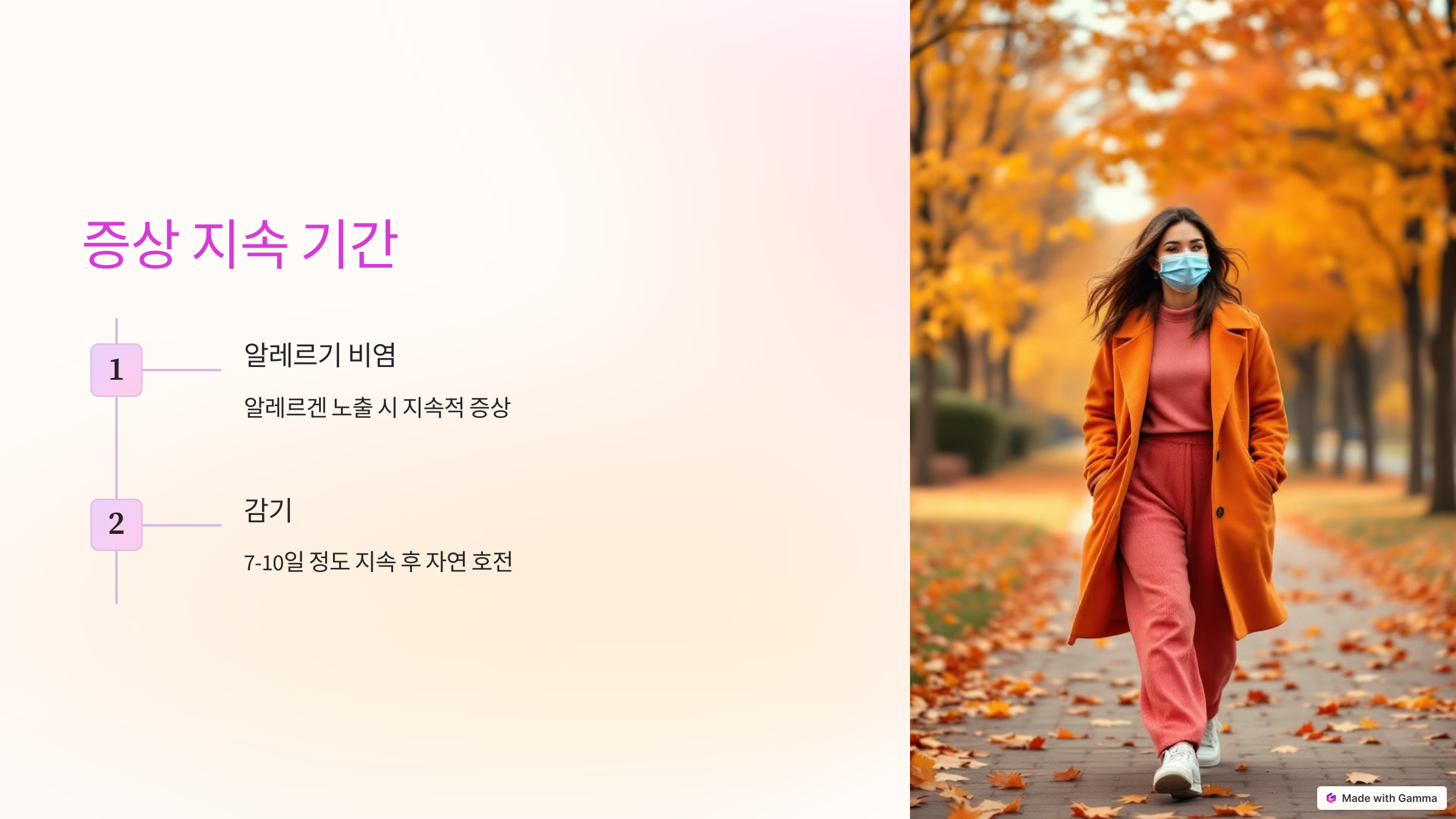| 지속 기간 | 알레르겐에 노출된 동안 지속 | 보통 7-10일 동안 지속 후 호전 |